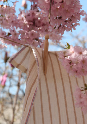 Der Stoff ist beidseitig verwendbar. Die eine Seite ist breit-, die andere Seite fein gestreift.