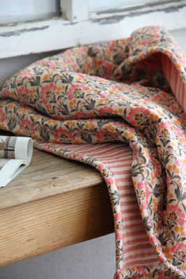 Diese Decke besteht aus doppellagigem Musselin & einem Baumwollgewebe. Die beiden Stoffe sind durch eine Apsteppung (Quilting) miteinander verbunden und leicht wattiert. Dadurch entsteht eine angenehme Haptik und ein dezenter Volumeneffekt.